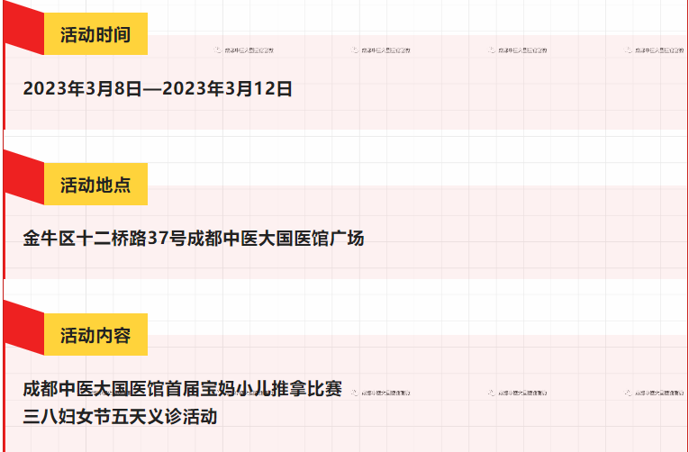 【3.8 宝妈比赛赢大奖 + 女神节福利国医馆广场免费义诊五天】 阳春三月阳春三月,春风拂面,在这个充满春意、充满爱意的三月里,一年一度的“三八妇女节”即将到来,为了增强亲子之间的互动,三八节当日成都中医大国医馆开展首届宝妈小儿推拿比赛!不仅参赛选手可以赢大奖国医馆还为市民朋友们准备了为期五天三八节健康义诊活动!